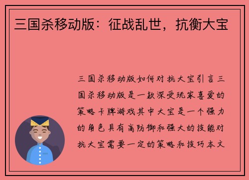 阅读1. 游戏简介 鼎力三国杀是一款基于三国时期的策略卡牌游戏,玩家扮演三国时期的武将,通过使用各种卡牌和技能来进行战斗和谋略。游戏的目标是通过击败对手的武将,最终成为最后的胜利者。 2. 角色选择 在游...